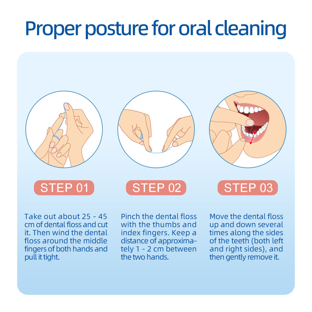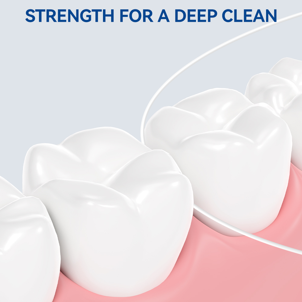 خيط تنظيف الأسنان: خيط أسنان من مادة PTFE (بولي تترافلوروإيثيلين) أو خيط أسنان من النايلون عالي الجودة ومقاوم للتمزق، وغالباً ما يكون مشمعاً لسهولة الاستخدام.